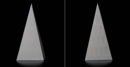 - (2) 切片软件在路径规划中尽量保证外壁速度始终在电机的非共振区间(通常在100-300mm/s), 在一些必须降速的区域(如冷却时间),启用优先降低填充速度,来避免外壁产生振纹。如下图示例, (左侧是未优化的切片打印的效果图,右侧是优化后的打印效果图)。