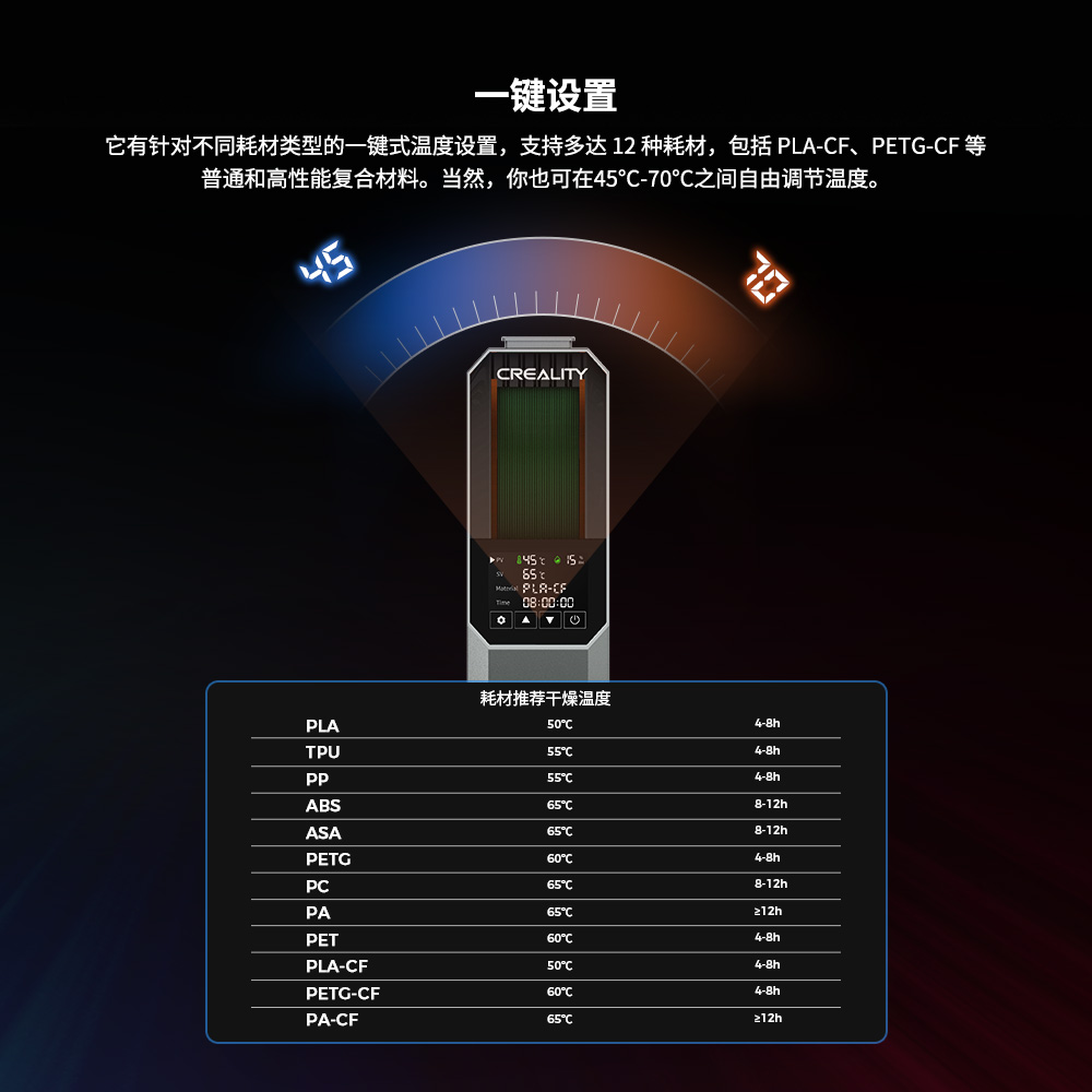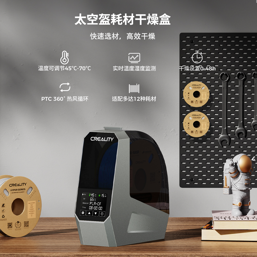 此外,太空盔耗材干燥盒配有3.7英寸触摸屏,操作简便,让您轻松监测干燥环境。它兼容1.75mm、2.85mm的3D打印耗材,还能针对不同耗材类型的预设温度设置,支持多达 12种耗材,包括PLA-CF、PA-CF、ASA等高性能材料。当然,你也可在45°C-70°C之间自由调节干燥温度。搭配高速打印机、高速耗材,实现又快又好的打印体验!