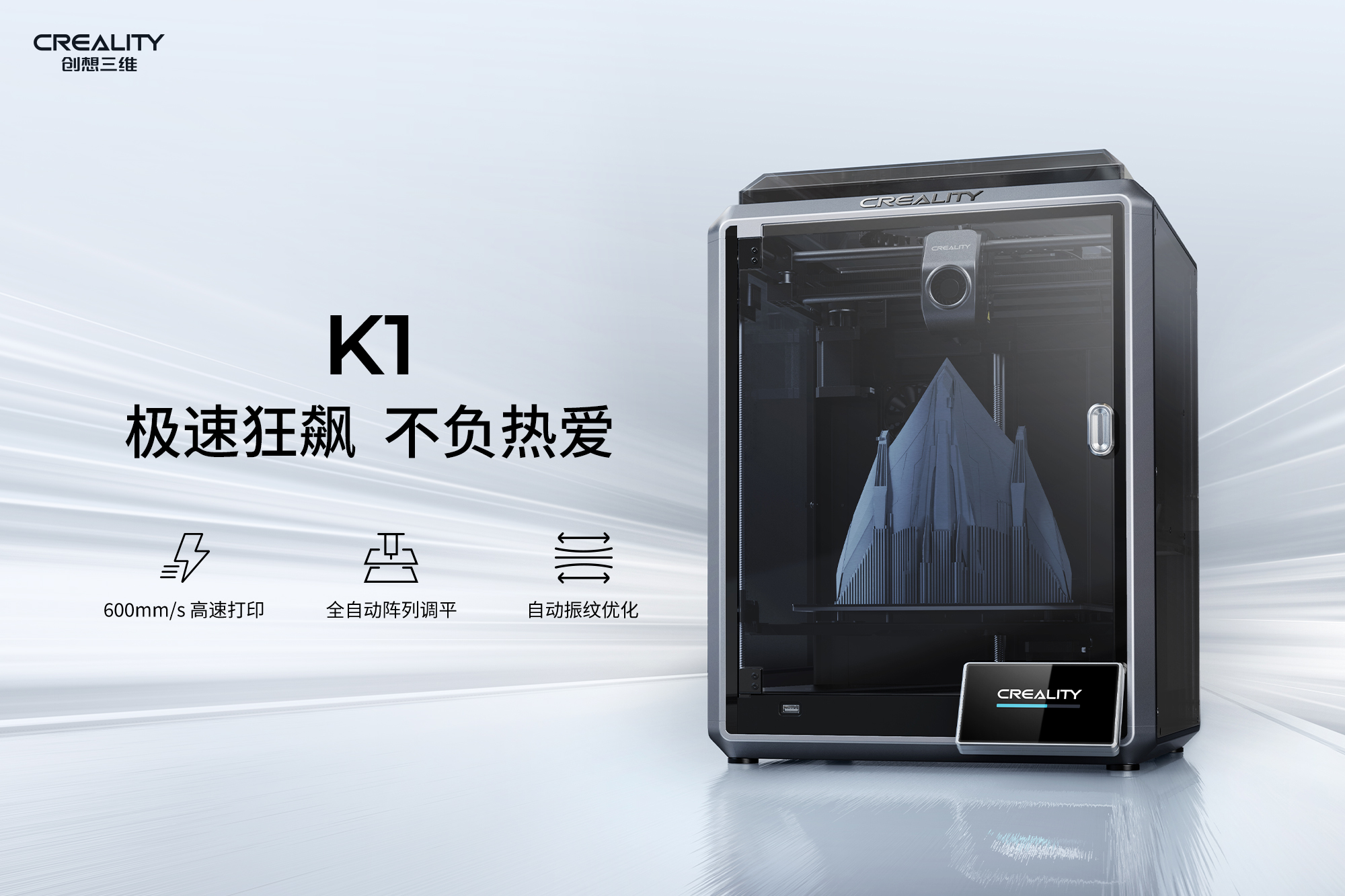 K1系列打印机之所以能获得2024红点产品设计大奖,源于其独特的设计和卓越的性能。作为创想三维的旗舰产品,K1和K1 Max以惊人的打印速度和卓越的性能而著称。K1、K1 Max均拥有600mm/s的最高打印速度,比常规3D打印机快了12倍;加速度最高可达20000mm/s²,从零加速到600mm/s只需0.03秒,引领着高速3D打印的新时代,是名副其实的速度王者,是追求高速高效的用户的首选。适中的价格和卓越的打印质量,使其成为换新用户、打印农场、小批量生产企业的首选。