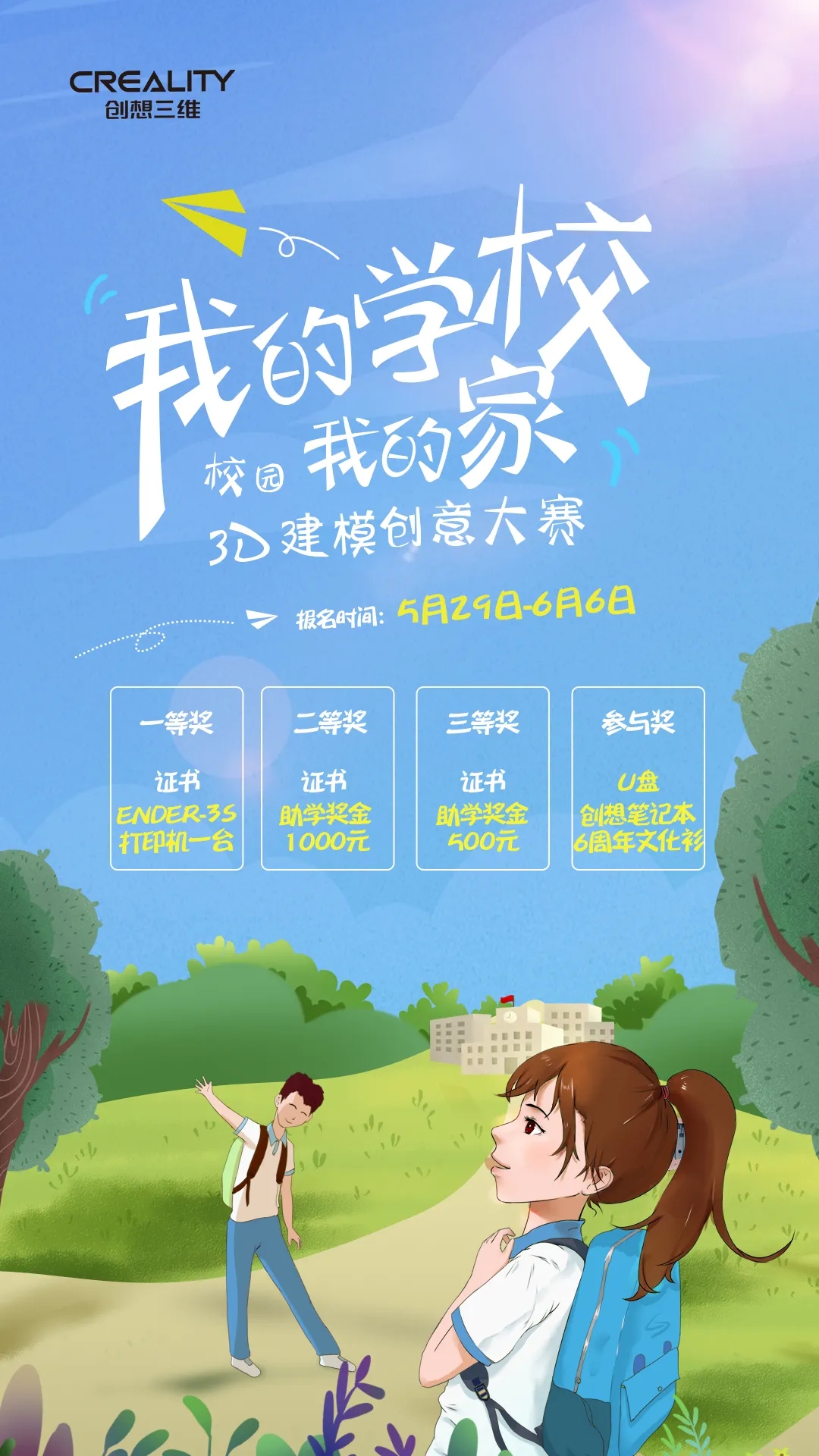 只要把你在校园内的景象,通过你的创意小宇宙发挥出来,建立3D模型进行参赛,就有机会获得由创想三维提供的Ender-3S黑科技3D打印机一台,另外还有更多大奖等你来拿! 通过发送姓名+学校到创想社团微信或者创想社团QQ张正伟处报名。(仅限已经与我们达成社团合作的学校参与) 1、学生可任意在学校选景,可以是学校的某个角落,或者对你来说有意义的地方,也可以是整个学校的模样。选定后进行3D建模,所用软件不限。 2、把你选定的景点,越精细越好地创建出来,细节越多,得分越高。 3、参与人数为1-3人。可以个人参赛,也可以小组形式参赛。