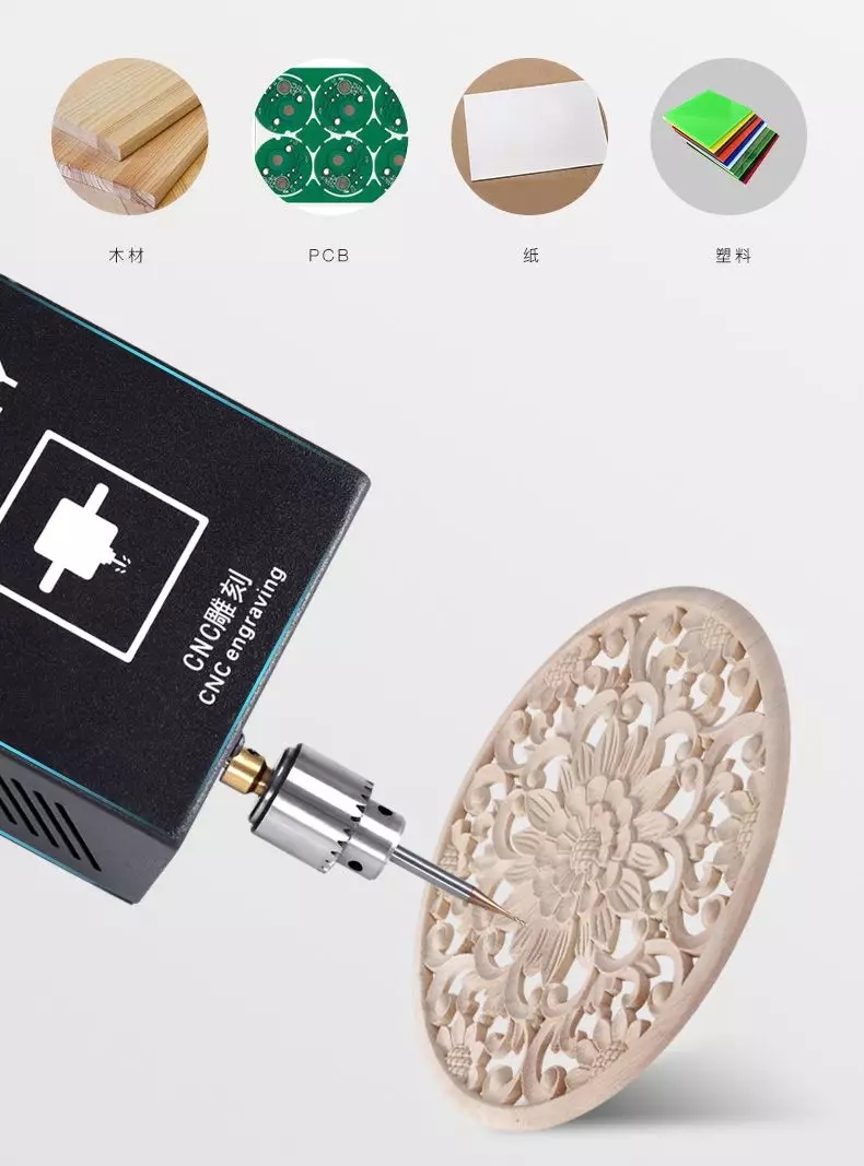 CNC切割刀转速快,切割模型光滑度高,曲面光滑,有效避免了切割过程中出现裂纹,而产生模型崩裂现象,可切割木材、PCB、纸、塑料等。