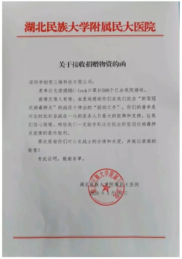 湖北民族大学附属民大医院在接受到我们的口罩扣后,非常感谢我们的关爱,并表示对我们的口罩扣十分喜爱,希望可以多赠送一些。