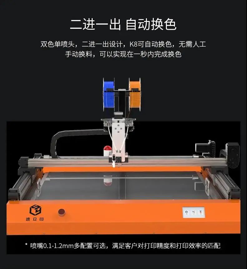 K8发光字3D打印机具有800*800*100mm的成型尺寸,基本满足广告字各型号需求。K8采取二进一出设计,无需人工换料,一秒内即可实现颜色转换!还采用金属双驱动双挤出齿轮,铁氟龙管辅助送料,让打印过程更加顺畅。XYZ轴采用工业级高端封装模组,重复定位精度可达0.02mm,完美显现细节。