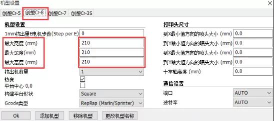 2、根据你的机型在切片软件上设置机器最大打印尺寸,不同的机器具体的参数设置如下: